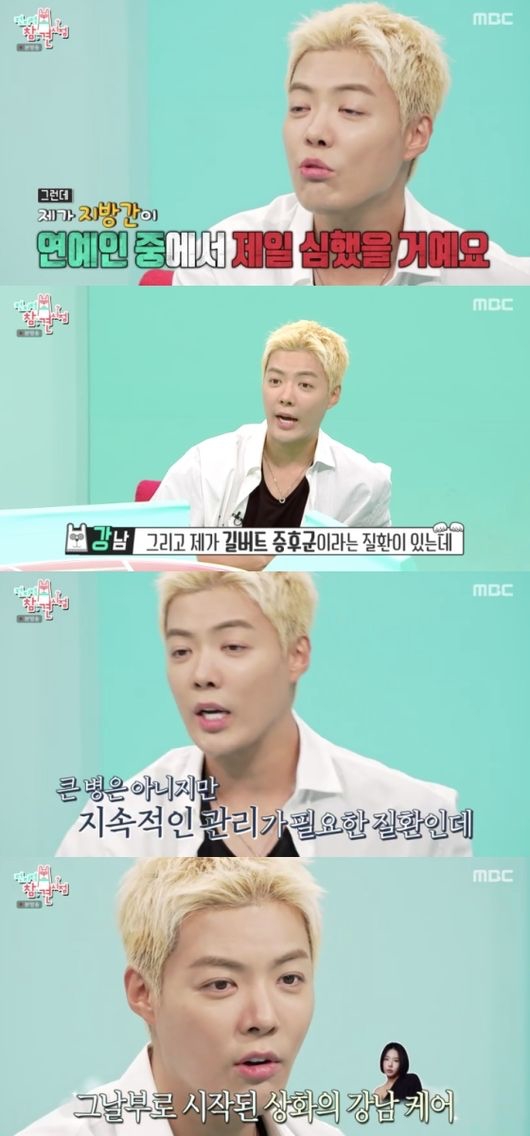 강남은 “제가 지방간이 심했다. 연예인 중 제일 심했다. 술도 많이 마셨다. 게다가 길버트 증후군이라는 질환까지 있다”며 과거 건강 상태를 고백했다.