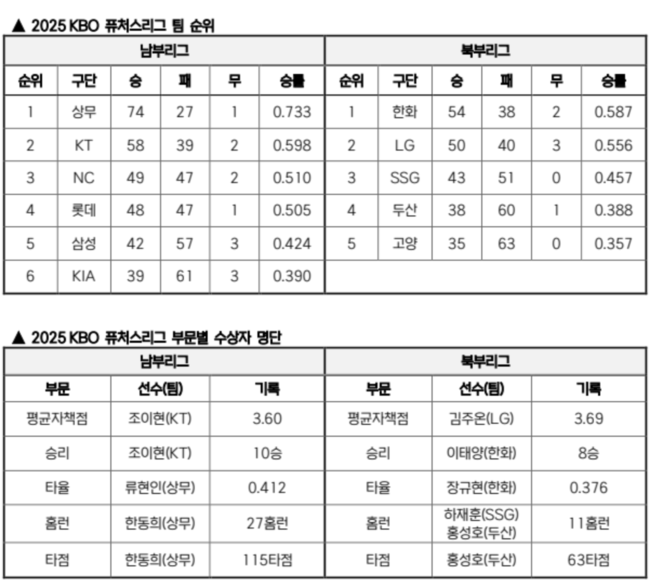 2025 KBO 퓨처스리그는 11개 팀이 남부(상무, KT, 삼성, NC, 롯데, KIA)와 북부(한화, SSG, LG, 두산, 고양(히어로즈)) 2개 리그로 진행됐다. 남부리그는 박치왕 감독이 이끄는 상무가 2012년부터 14년 연속 1위에 올랐다. 북부리그는 이대진 감독이 이끄는 한화가 2위 LG를 3게임차로 제치고 4년 연속 우승을 거머쥐었다.