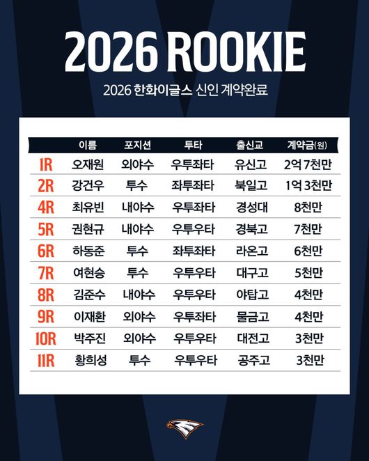 프로야구 한화 이글스가 지난 27일 2026년 신인 10명과 계약을 완료했다고 28일 발표했다.