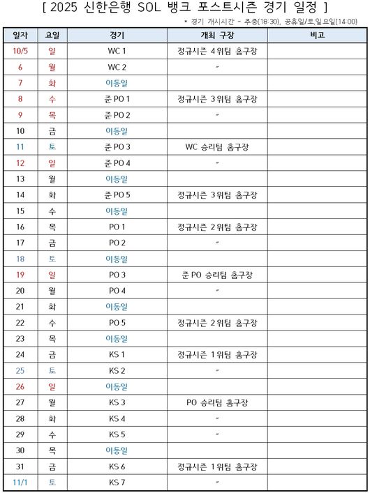 2025 포스트시즌에는 노게임, 강우콜드를 적용하지 않으며, 서스펜디드 규정만 적용한다.