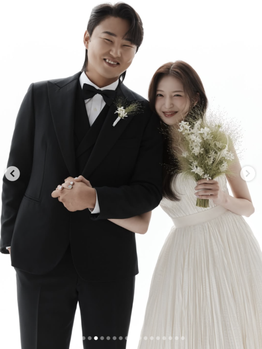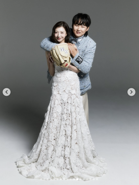 이와 함께 공개된 웨딩화보에서는 김지연과 3살 연하의 남편 정철원의 모습이 담겼다. 두 사람은 화려한 웨딩드레스와 수트 차림으로 시선을 사로 잡았다.