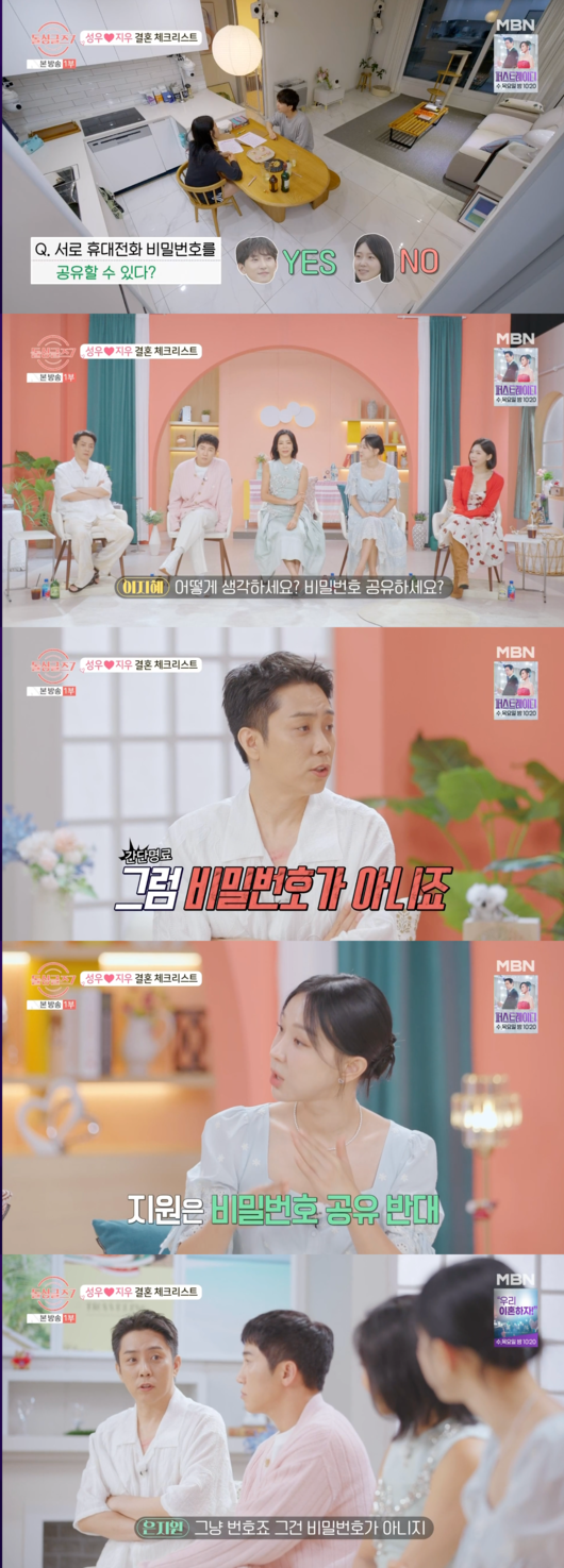 두 사람은 서로의 결혼관을 알아보는 '결혼 체크리스트'를 진행했다. 비밀번호 공유에 대한 질문이 나오자, 스튜디오에서 이를 지켜보던 은지원은 "그럼 비밀번호가 아니죠"라며 단호한 소신을 밝혔다. 은지원은 "그냥 번호죠. 그건 비밀번호가 아니지"라고 덧붙이며 자신만의 확고한 철학을 내세웠다.