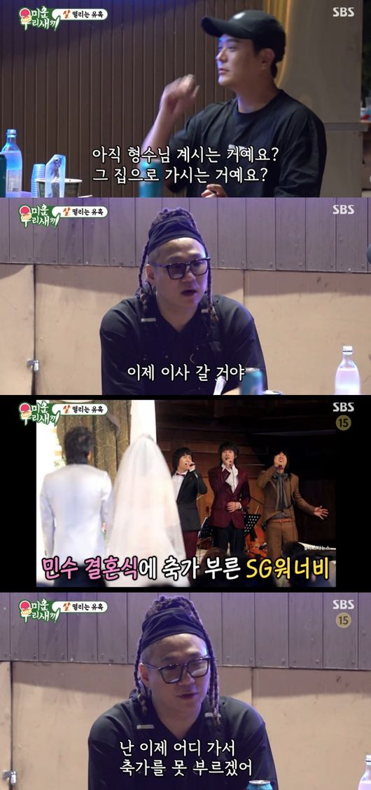 그러자 김용준은 “형 그거 기억하냐. 형수님이랑 결혼할 때 제가 축가를 했었다”라며 20년 전 윤민수 결혼식 당시를 떠올렸다. 눈을 질끈 감은 윤민수는 “난 이제 어딜가도 축가를 못 부르겠다. 자격이 없다고 생각해서”라고 털어놨다.