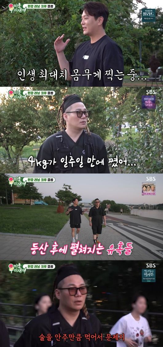 앞서 몸무게를 확인한 윤민수는 80.6kg에 충격을 받았던 바. 이날 다이어트에 도전한 윤민수는 러닝 장비를 착용하고 한강으로 향했다. 그리고 그곳에서 김용준을 만났고, 이내 두 사람은 인생 최대 몸무게를 찍었다고 고백했다.