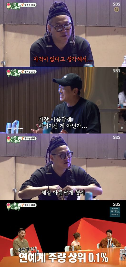 그러자 김용준은 “근데 저도 축가 같은 거 가끔 한다. 지금까지 많이 했었는데 이혼하신 분들도 있다. 근데 그중에서 가장 아름답게 헤어지신 게 아닌가”라고 웃었다. 윤민수 역시 “제일 아름답게 했지”라고 수긍했다.