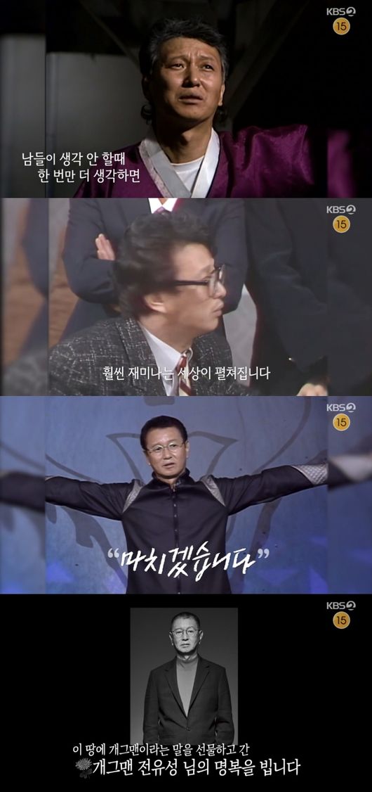 29일 방송된 KBS 2TV 예능 ‘개그콘서트’에서는 故(고) 전유성의 생전 무대 위 모습을 공개해 눈길을 끌었다.