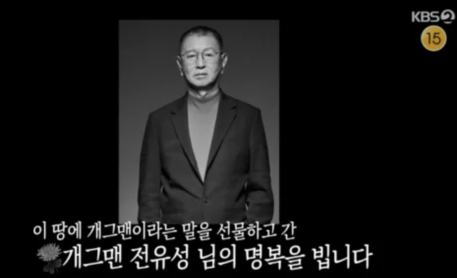 지난 29일 방송된 KBS 2TV 예능 ‘개그콘서트’에서는 고인의 생전 무대 위 모습이 공개됐다. 건강하던 시절 무대에 오른 전유성은 특유의 담담하면서도 울림 있는 목소리로 “개그맨들은 웃기기 위해서 굉장히 많은 생각들을 합니다. 남들이 생각 안 할 때 한 번만 더 생각하면 훨씬 재미나는 세상이 펼쳐집니다. 마치겠습니다”라며 짧지만 깊은 철학을 전했다. 방송 말미에 “이 땅에 개그맨이라는 말을 선물하고 간 개그맨 전유성 님의 명복을 빕니다”라는 자막이 이어지자, 시청자들의 마음은 먹먹함으로 가득 찼다.