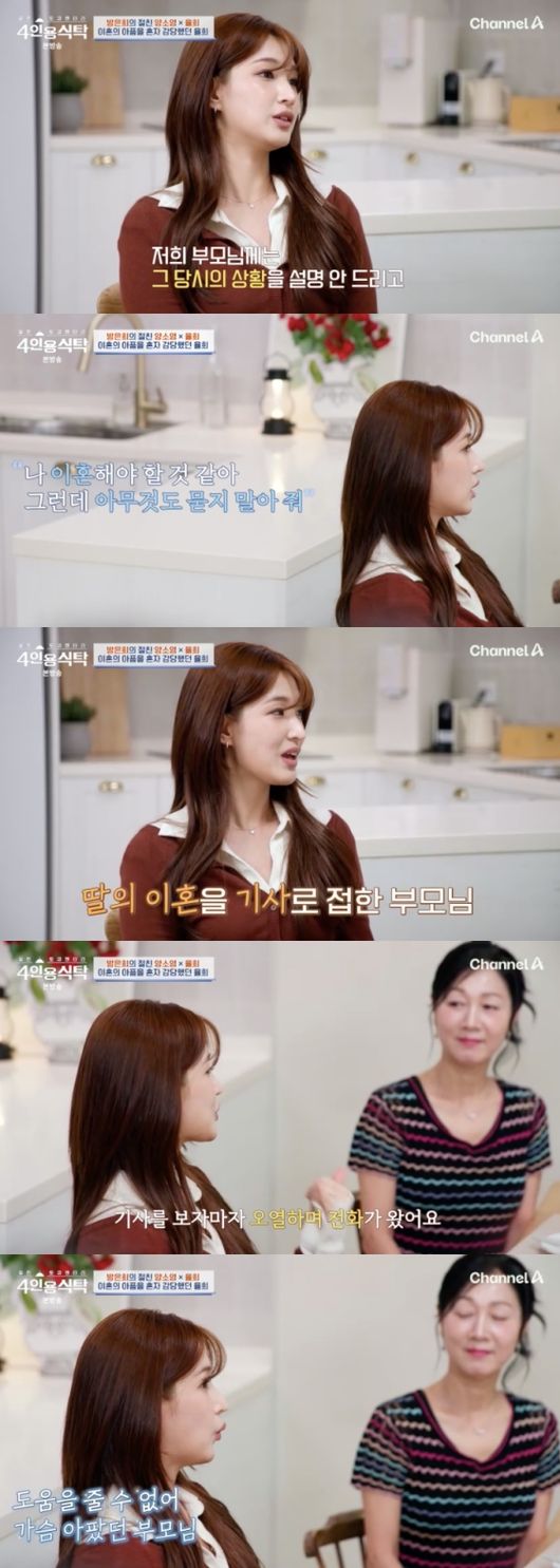 율희는 이혼 당시를 떠올렸다. 그는 “저희 부모님께는 당시의 상황을 잘 말씀 안 드리고 ‘나 이혼해야 할 것 같아. 그런데 아무 말도 하지 말아 줘’ 했다. 모든 분들이 알게 되었을 때 동시에 안 것이다. 저희 엄마가 기사를 보자마자 오열하며 전화가 왔다. 왜 몇 년 동안 이야기를 안 했냐고”라고 말했다.