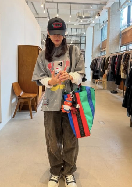 손예진은 박시한 티셔츠와 긴팔 티셔츠를 겹쳐 입었으며, 와이드 팬츠와 운동화, 푹 눌러쓴 모자 패션을 선보여 눈길을 끈다.