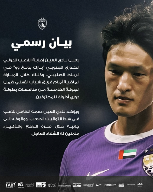소속팀 알 아인은 30일 공식 SNS를 통해 “한국국가대표 박용우가 지난 경기서 무릎에 심각한 인대손상을 입었다. 알 아인 구단은 힘든 시기를 보내고 있는 선수의 치료와 재활을 위해 최선의 지원을 다할 것이다. 박용우가 빨리 회복되길 기도한다”고 공식 발표했다.