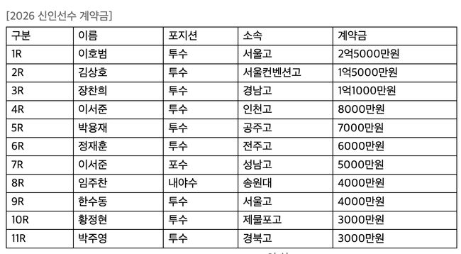 2026 드래프트 전체 9순위로 지명된 서울고 투수 이호범과 계약금 2억5000만 원, 연봉 3000만 원에 계약을 체결했다. 이호범은 신장 190cm 체중 95kg의 뛰어난 체격조건을 바탕으로 최고 150km의 빠른 직구와 완성도 높은 변화구를 보유하여 탈삼진 능력이 우수한 정통파 우완으로 평가받았다.