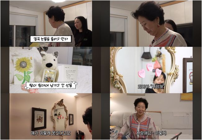 선우용여는 “하여튼 알아줘야 해. 사방에 다 있어요. ‘사랑해요’ 엄마 아버지 있는 데서. 너 웬일이니. 진짜 서프라이즈네”라며 웃다가 침대에 아기자기하게 인형과 그림 그리고 편지를 꾸려둔 김연재의 솜씨를 보고 마침내 눈물지었다.