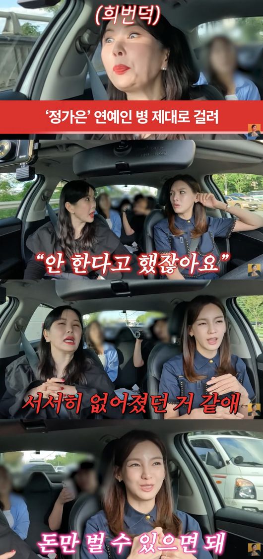 장영란은 “그때 너 돈 좀 벌지 않았냐”라고 물었고, 정가은은 “전세값 마련을 했다”라면서도 “쭉쭉쭉 달리다가 연예인 병이 살짝 왔다”라고 고백했다. 깜짝 놀란 장영란은 “정말 감사하다. 연예인 병 걸린 정가은 씨를 안 만나서”라고 말했다.