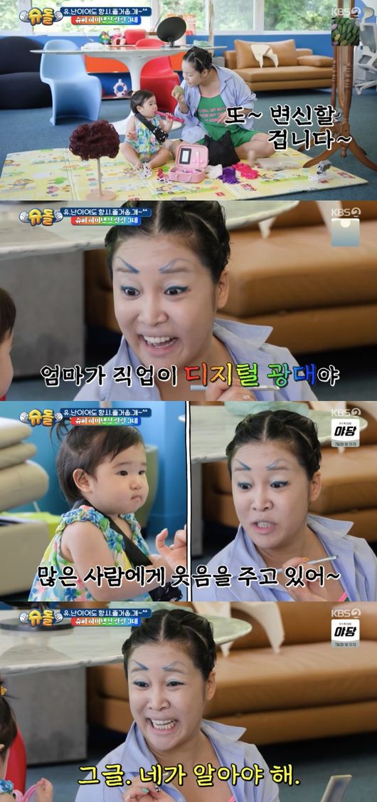 이날 랄랄은 폭풍 성장한 14개월 딸 서빈이 밥을 먹인 뒤 분장에 나섰다. 자신을 빤히 바라보는 딸에 랄랄은 “서빈아 엄마가 직업이 디지털 광대야. 그래서 웃음을 팔고 다녀”라고 말했다.