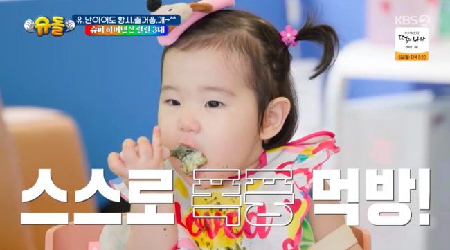 ‘슈퍼맨이 돌아왔다’ 랄랄의 딸 서빈이가 김준호 둘째 아들 정우 못지 않는 먹방을 선보였다.