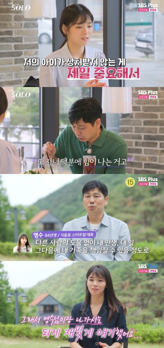 또 옥순이 “영수님이 사랑하는 사람의 모든 걸 다 이해하고 수용할 준비가 되어있구나 진심이 느껴진다”라고 하자 영수는 “자녀분이 제일 소중하다는 거 100번 공감된다. 자녀 때문에 힘이 나는 거고”라고 말했다.