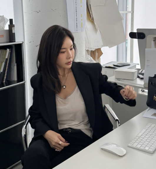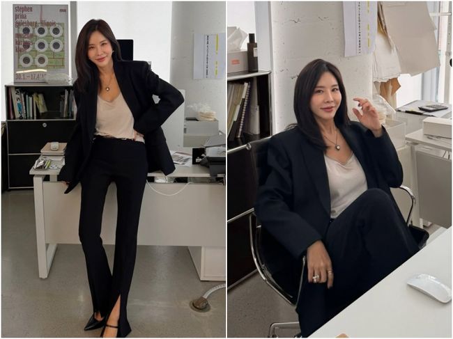 사진 속 김준희는 블랙 슈트에 베이지 톱을 매치한 시크한 오피스룩을 선보이며 세련된 분위기를 자아냈다. 책상 앞에 앉아 업무를 보는 모습부터, 거울 셀카, 장난스럽게 모니터 사이로 얼굴을 내민 컷까지 다채로운 매력을 드러냈다.