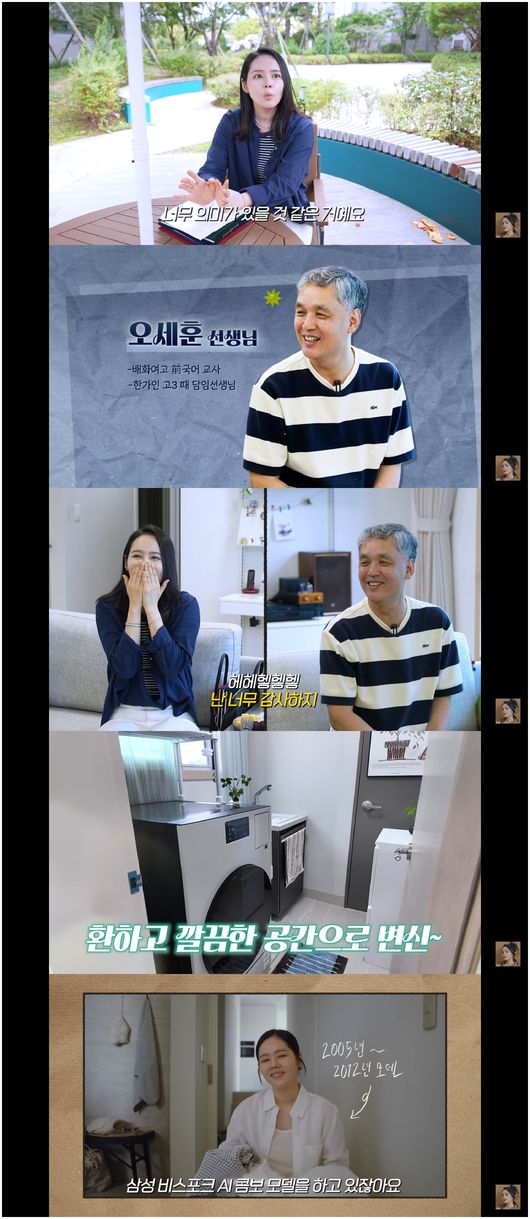 한가인은 선생님과 대화를 나누고자 졸업 앨범을 챙겼으며, 또 다른 선물을 준비했다. 한가인은 “제가 삼성 비스포크 AI 모델을 하고 있는데 제자가 광고 모델을 하고 있는 세탁기를 선물로 드리면 좋지 않을까 했다. 그런데 세탁기만 보내면 안 될 거 같았다. 그래서 보내고도 신경을 썼다”라고 밝혔다. 심지어 세탁실 인테리어까지 바꾼 한가인에 대해 선생님은 기뻐했다.