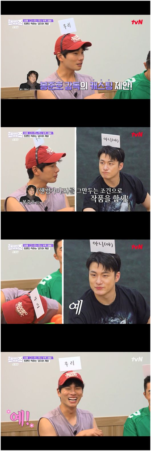 이어 '금지어 게임'이 시작되었다. 신승호는 “본부장님에게도 말했지만, 저는 사실 새로운 포맷이 정말 즐겁다”라며 화두를 꺼냈다. 이이경은 “만약 봉준호 감독님이 캐스팅하면서 ‘핸썸가이즈를 그만 둬라’라고 하면 뭐라고 할 거냐”라며 밸런스 게임을 제안했다. 신승호는 “네!”라며 고민도 없이 답했다.