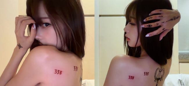 공개된 사진에서 지젤은 과감히 상의를 탈의한 채 등을 노출한 모습이다. 그의 등에는 독특한 문양과 "333"이라는 숫자의 타투가 새겨져 있어 눈길을 끈다.