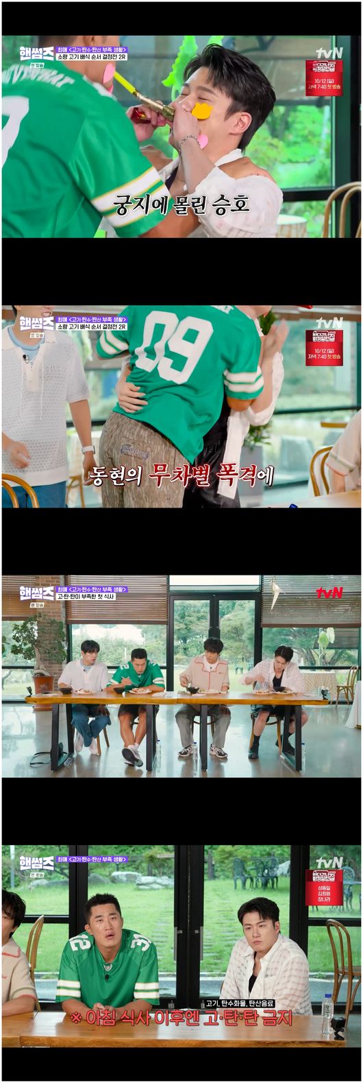 그러다 차태현은 물풍선으로 안면을 가격 당했으나 물풍선이 터지지 않아 고통만 겪었다. 이이경은 “무슨 풍선이 안 터져”라며 놀랐다. 차태현은 “코피가 났어야 하는데. 그래야 먹었을 텐데”라며 고기에 진심인 모습을 보였다.