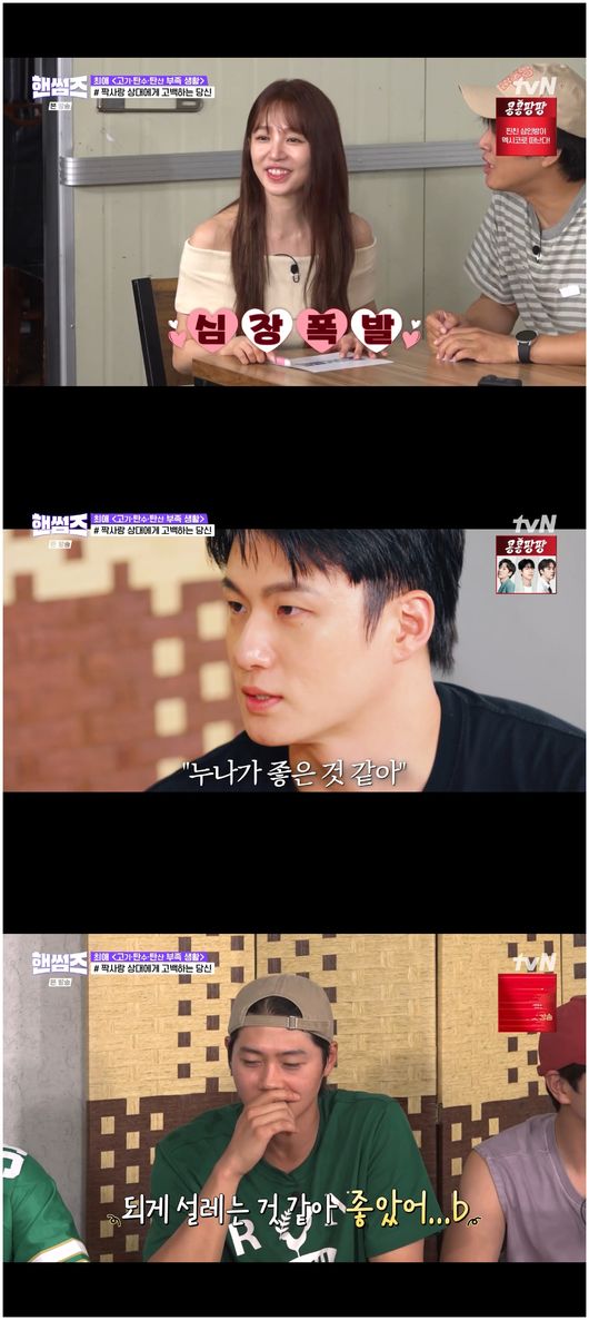신승호는 “누나, 나는 누나가 좋아하는 거 같아. 계속 생각 나고, 네가 좋아하는 거 같아”라며 연기력을 뽐냈다. 이에 윤은혜는 “되게 설렌다”라며 흐뭇해했고 오상욱은 “이거 나중에 한 번 써먹어야겠다. 너무 좋다”라며 거듭 감탄했다./osen_jin0310@osen.co.kr