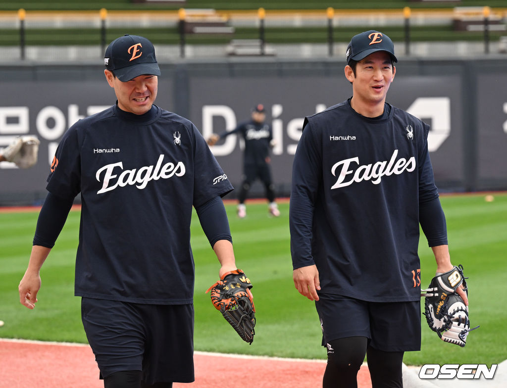 한화 이재원, 최재훈이 훈련을 위해 이동하고 있다. 2025.10.03 /cej@osen.co.kr
