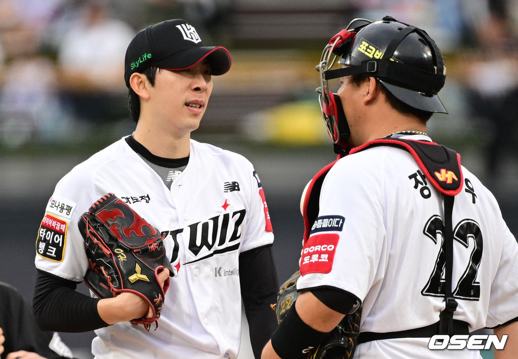 KT 선발 오원석이 흔들리자 포수 장성우가 마운드에 올라 대화를 하고 있다. 2025.10.03 /cej@osen.co.kr