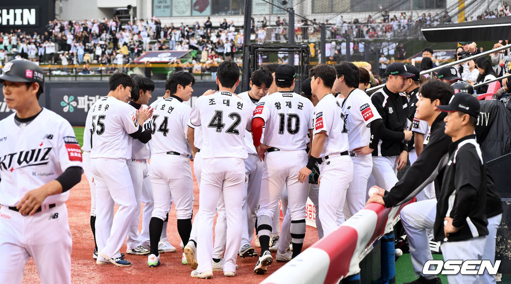 1회초 6실점으로 출발한 KT가 이닝을 마친 뒤 미팅을 하고 있다. 2025.10.03 /cej@osen.co.kr