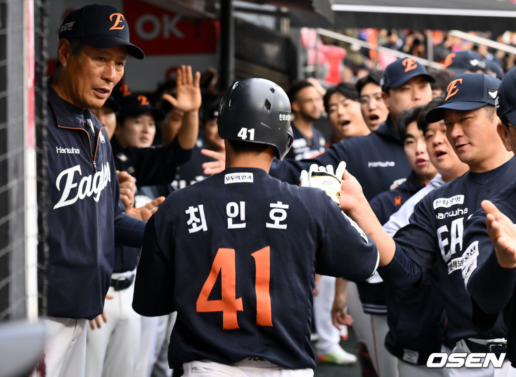 1회초 무사 2,3루 한화 최인호가 KT 오원석을 상대로 선제 3점 홈런을 날린 뒤 더그아웃에서 환영을 받고 있다. 2025.10.03 /cej@osen.co.kr