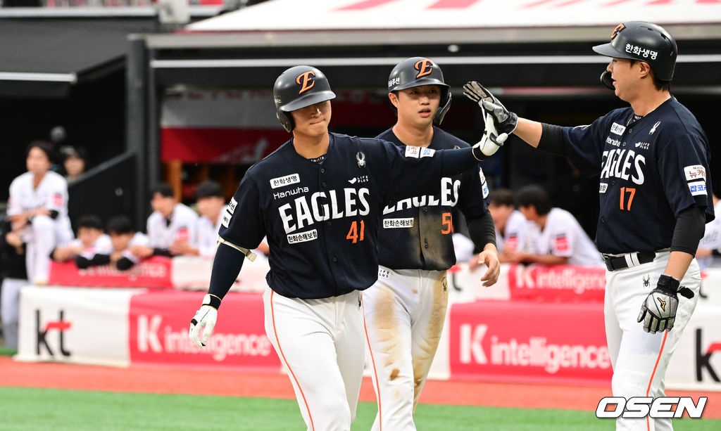 1회초 무사 2,3루 한화 최인호가 KT 오원석을 상대로 선제 3점 홈런을 축하를 받고 있다. 2025.10.03 /cej@osen.co.kr