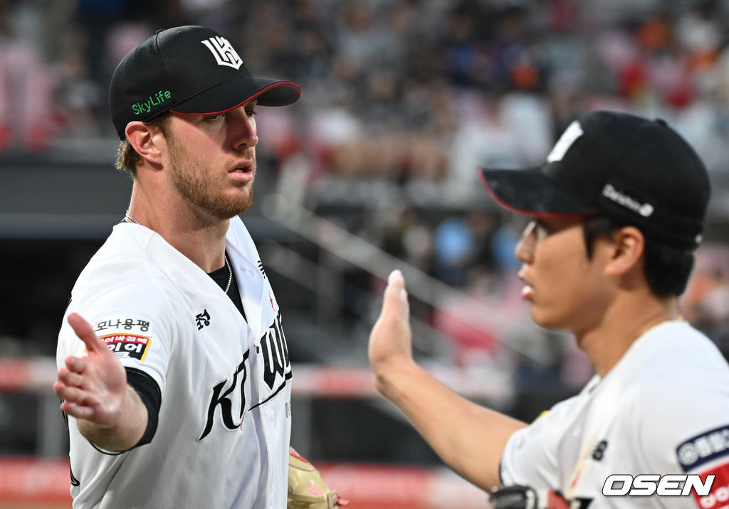3회초 이닝을 마친 KT 패트릭이 유격수 장준원과 하이파이브를 하고 있다. 2025.10.03 /cej@osen.co.kr