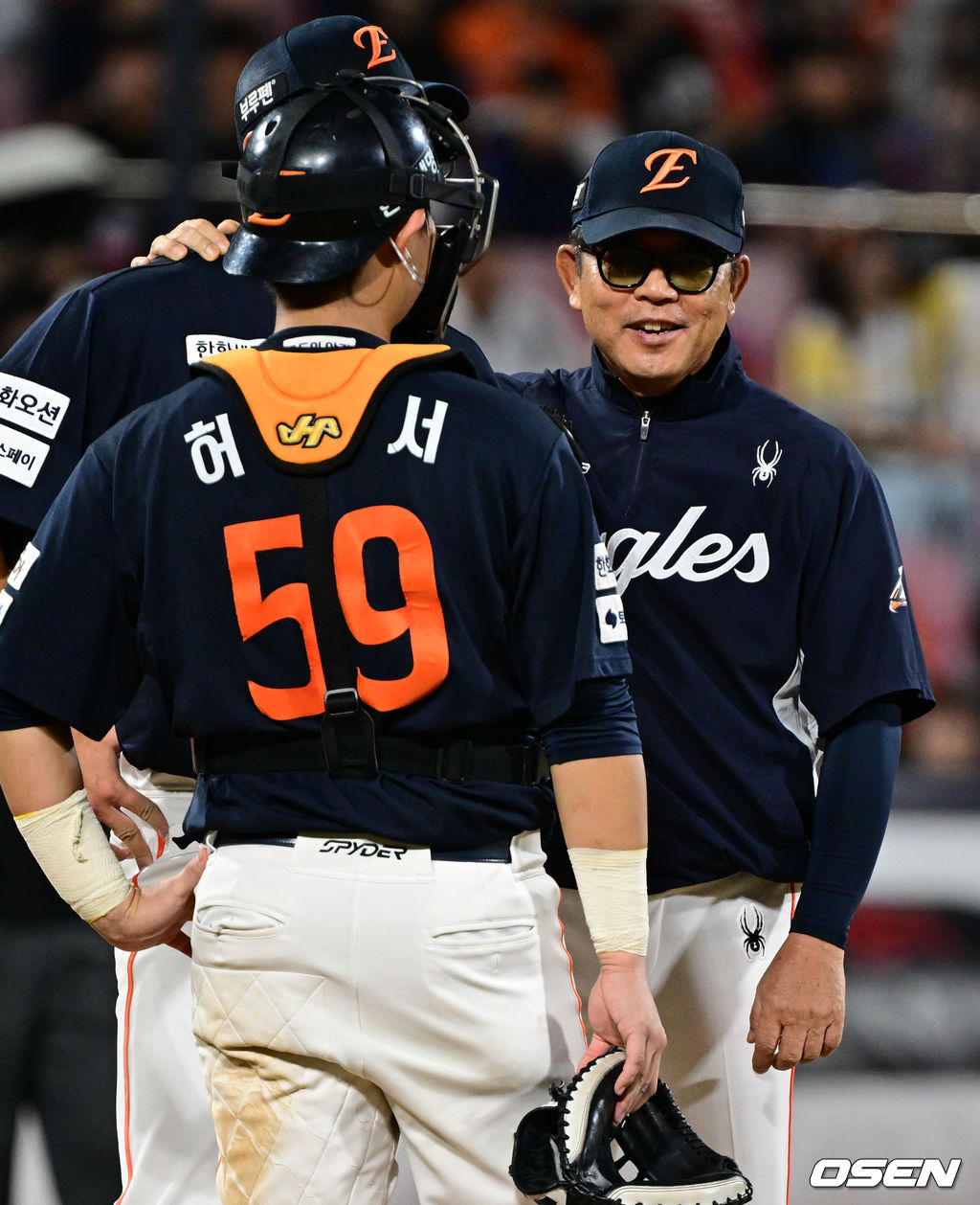 5회말 무사 1,3루에서 한화 양상문 코치가 마운드에 올라 투수 박준영을 다독이고 있다. 2025.10.03 /cej@osen.co.kr