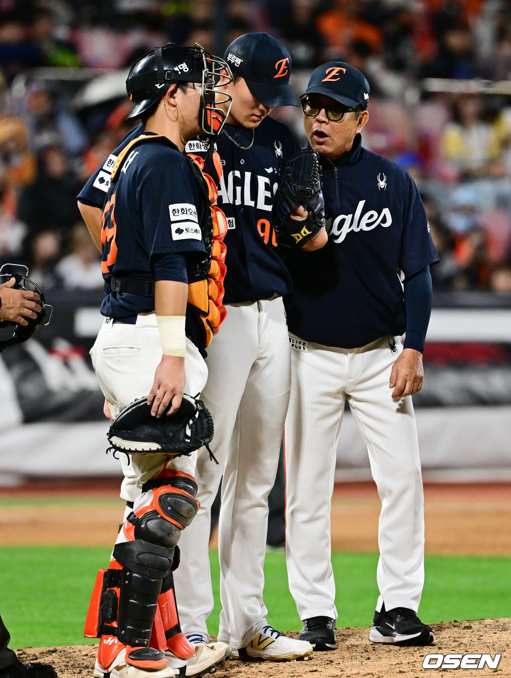 5회말 무사 1,3루에서 한화 양상문 코치가 마운드에 올라 투수 박준영을 다독이고 있다. 2025.10.03 /cej@osen.co.kr