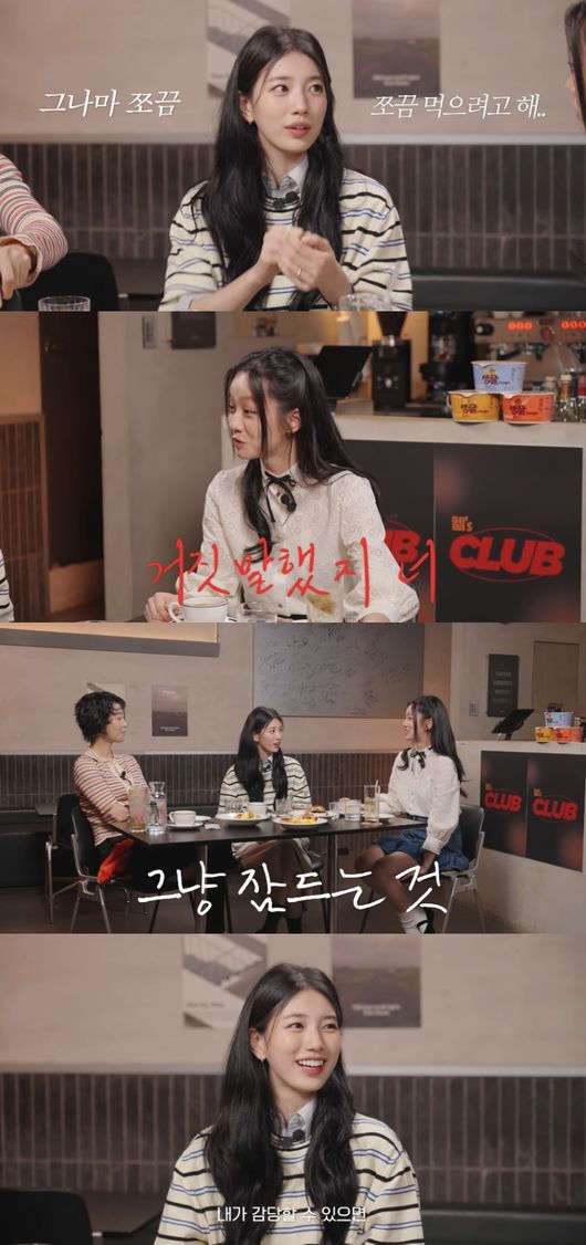 이주영이 “술 마시고 그냥 잠든 적 많지 않냐”고 하자 수지는 “요즘에는 그렇게까지 많이 마시지 않는다. 스스로 통제한다. 어렸을 때는 아무래도 조절을 못한다. 이제는 알고 하니까 그 정도까지 안 간다. 귀찮아서 못 씻는 경우가 많다. 스스로 되묻고 질문한다”라고 이야기했다.