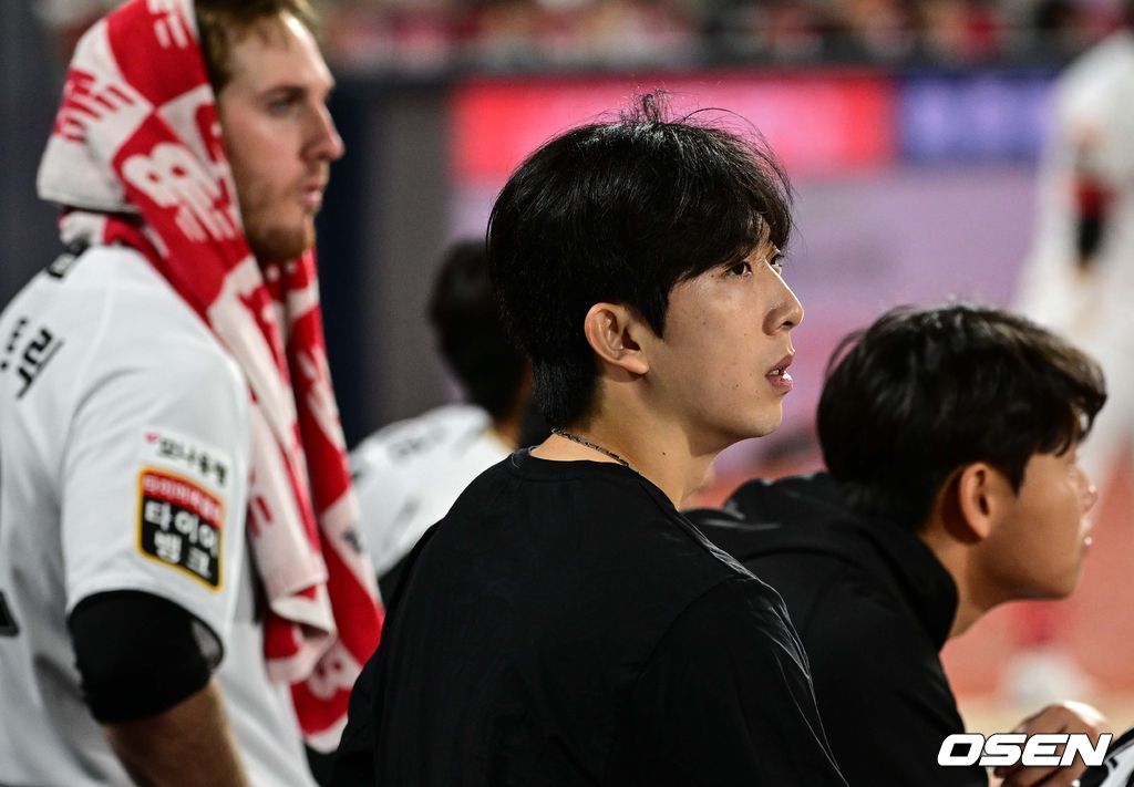 KT 오원석이 경기를 지켜보고 있다. 2025.10.03 /cej@osen.co.kr