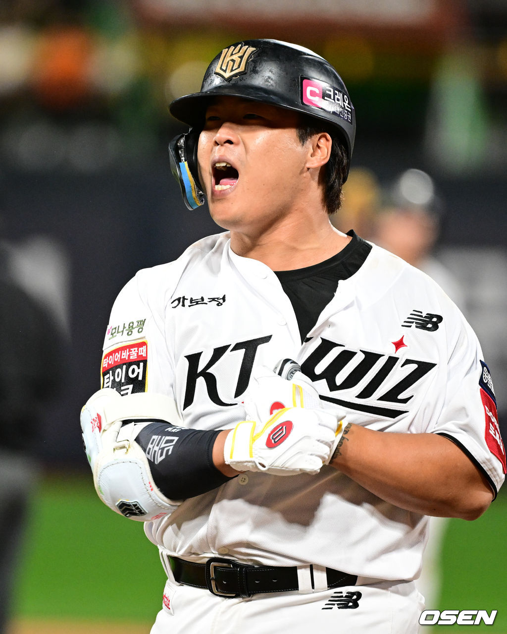 9회말 1사 1,3루에서 KT 강백호가 적시타를 날린 뒤 포효하고 있다. 2025.10.03 /cej@osen.co.kr