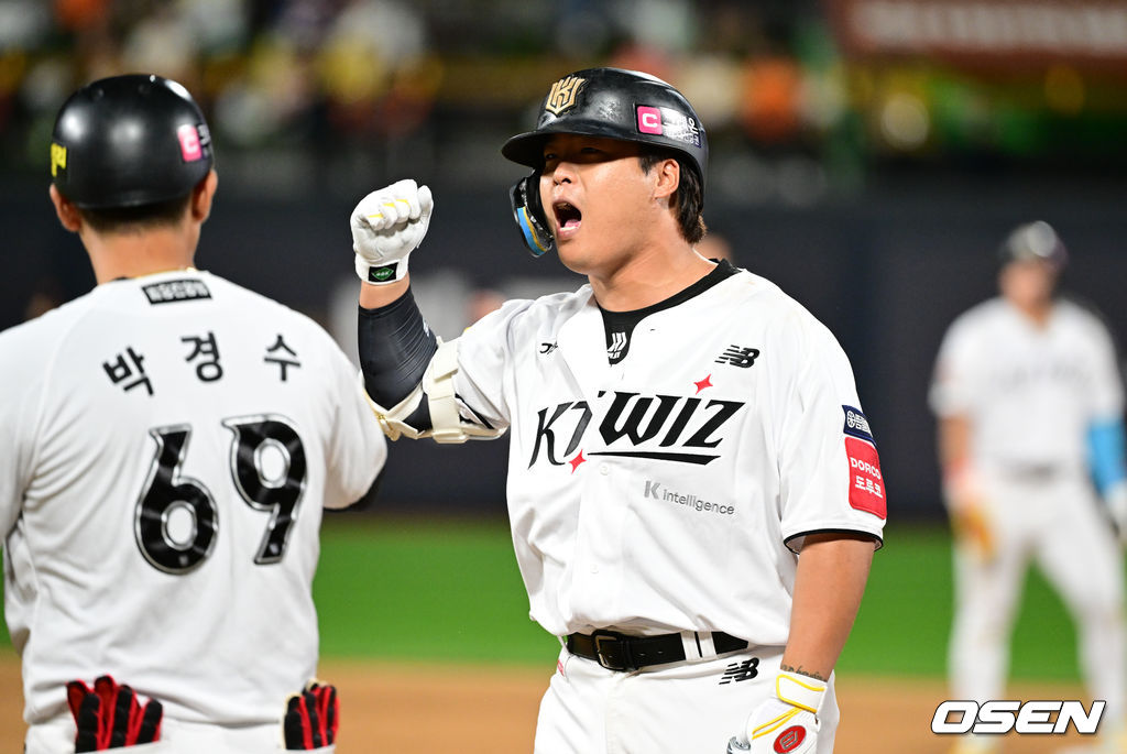 9회말 1사 1,3루에서 KT 강백호가 적시타를 날린 뒤 포효하고 있다. 2025.10.03 /cej@osen.co.kr