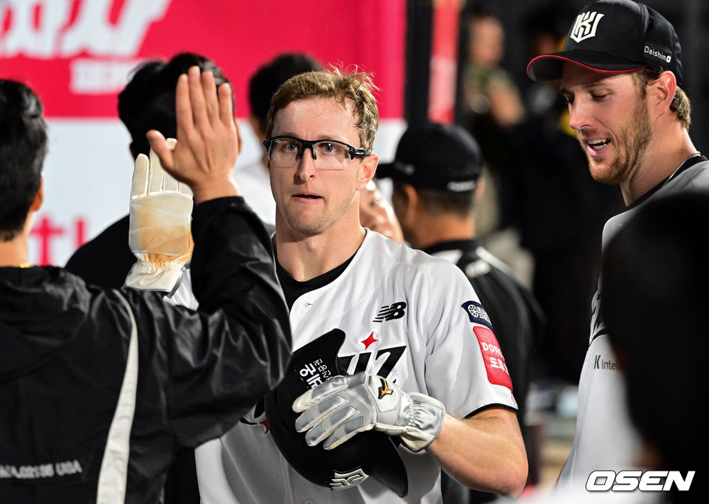 9회말 동점 2타점 2루타를 날린 스티븐슨이 이닝을 마친 뒤 더그아웃에서 환영을 받고 있다. 2025.10.03 /cej@osen.co.kr