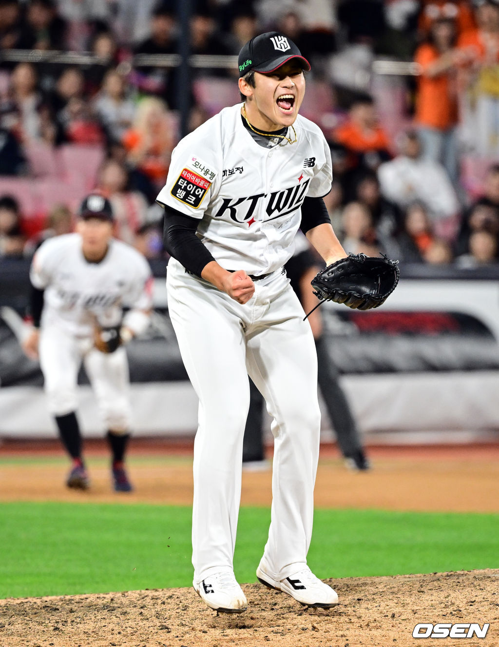 KT 박영현이 연장 10회초를 무실점으로 막아낸 뒤 포효하고 있다. 2025.10.03 /cej@osen.co.kr