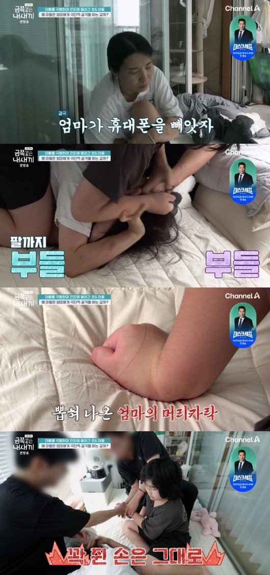 위험한 상황에 제작진까지 투입돼 금쪽이를 말렸지만, 금쪽이는 팔까지 부들거리며 손을 놓지 못했다. 간신히 떼어놓은 손에는 뽑혀 나온 엄마의 머리카락이 보였고, 금쪽이는 다시 이불 속으로 들어갔다.