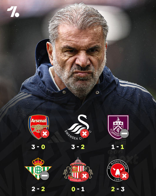 하지만 재기를 꿈꾸는 포스테코글루 감독은 6경기에서 단 한 번도 이기지 못했다. 데뷔전에서 아스날에 0-3으로 대패했고, 카라바오컵에선 2부리그 스완지 시티에 2-3으로 충격 역전패했다. 이후로는 승격팀 번리와 선덜랜드를 상대로 각각 1-1 무승부, 0-1 패배에 그쳤고, UEL 무대에서도 베티스와 미트윌란을 상대로 승리하지 못한 상황.