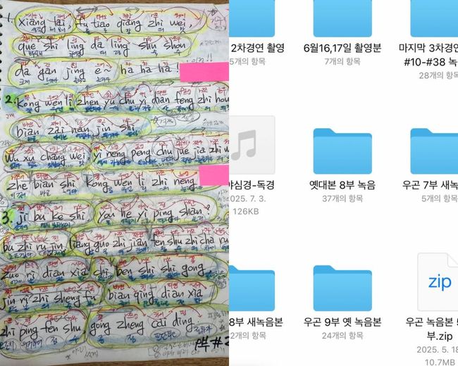 공개된 사진 속에는 빼곡히 적은 중국어 필기와 녹음 기록이 담겨 있어, 얼마나 치열하게 준비했는지 고스란히 전해진다. 병음, 억양, 강조, 끊어읽기 등 노트를 빽빽히 채운 기록이 감탄을 자아낸다.