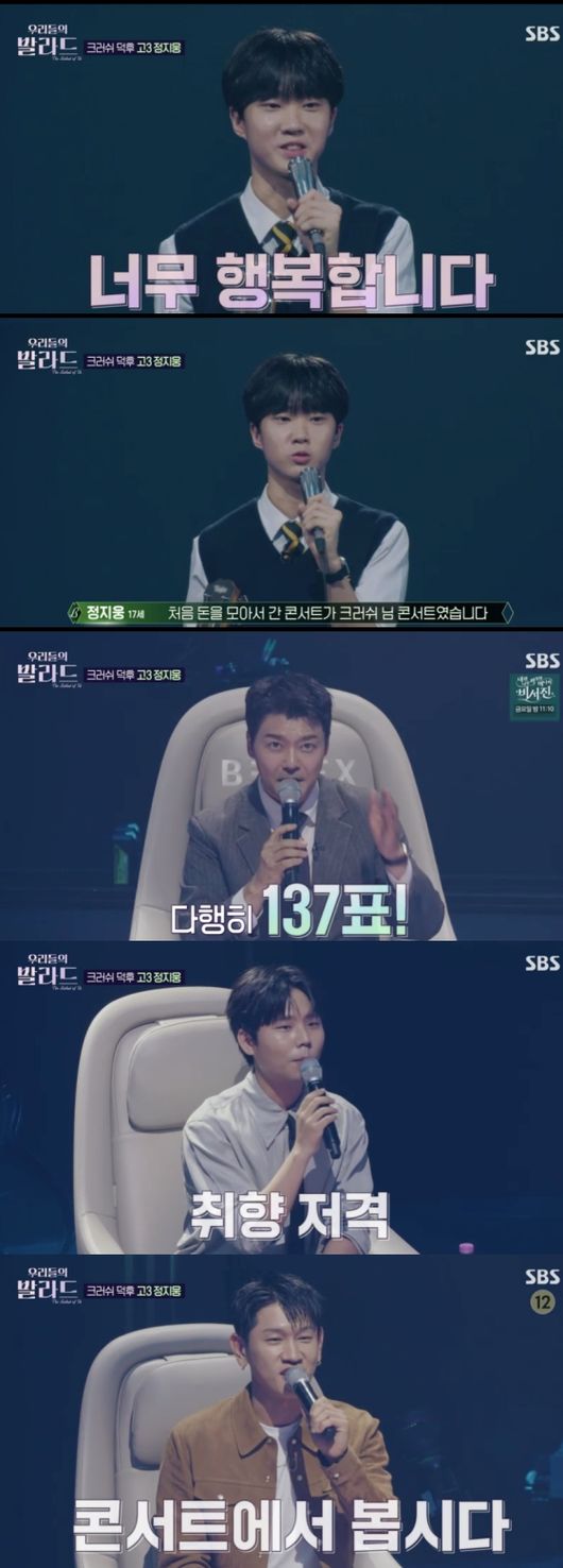 정지웅은 “처음 돈을 모아서 간 콘서트가 크러쉬 콘서트였다. 돈이 많이 없어서 하루밖에 못 갔다”라고 말하며 아쉬워했고, 크러쉬는 합격하면 콘서트에 초대하겠다고 밝혔다.