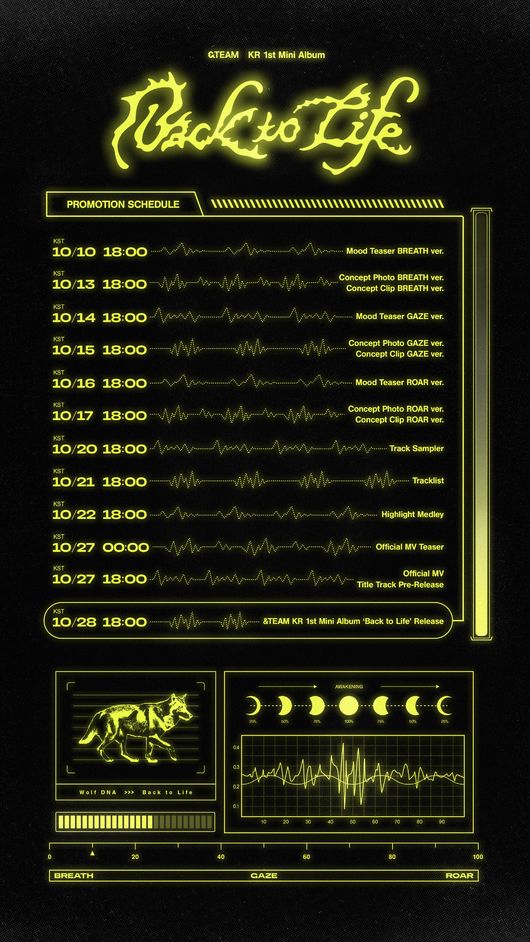 '숨(BREATH)', '응시(GAZE)', '포효(ROAR)'로 이어진 흐름에 따라 깨어나는 &TEAM의 서사도 기대된다. 팀 정체성인 'Wolf DNA'와 'Back to Life' 문구가 새겨진 박스 플롯(Box Plot) 옆에, 달이 차오르면 이들이 'Awakening(각성)'한다는 표식이 더해져 한층 진화한 &TEAM의 행보가 암시됐다.