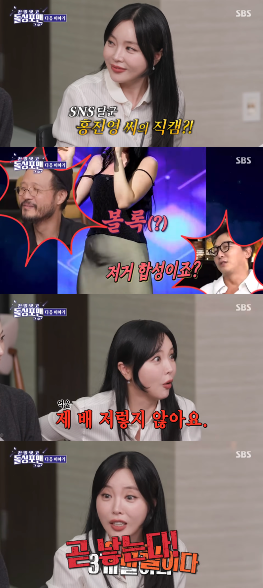 출연진은 직캠을 보며 “배가 왜 저래”, “저거 합성이죠?”, “너무했다 이건” 등 멘트를 통해 믿기지 않는다는 반응을 전했고, 홍진영 역시 “내 배 저렇지 않다”고 억울한 표정을 지었다.