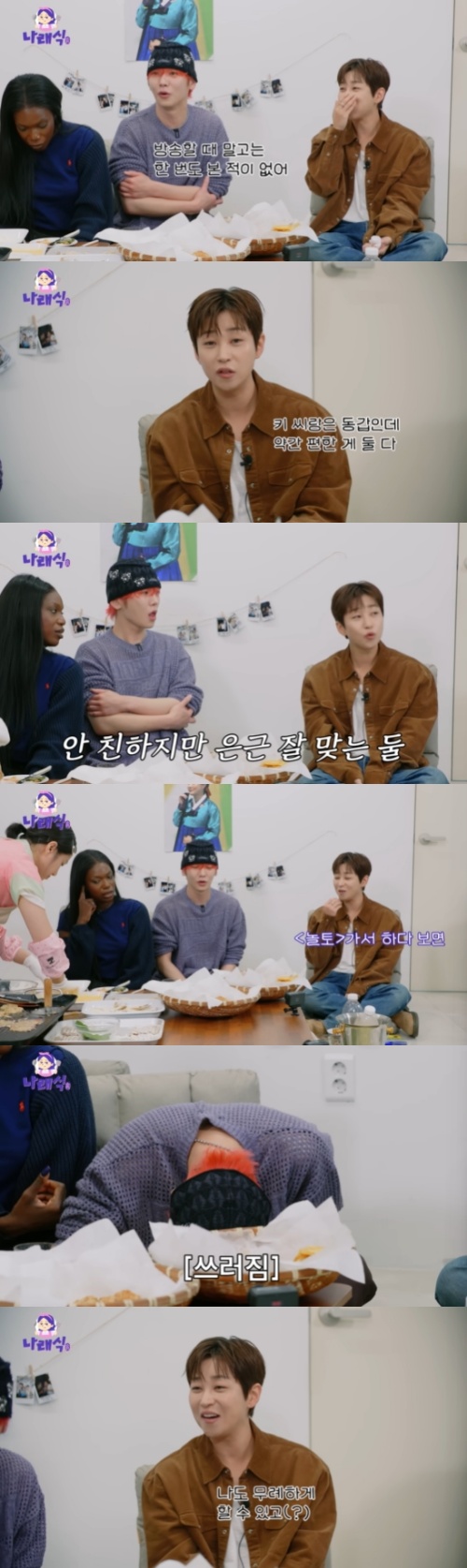 박나래는 "딘딘이랑 키는 동갑이냐?"고 물었고, 키는 "우리가 중간에 겹지인도 많다. 그래서 사람들이 우리가 친할거라고 생각하는데 방송할 때 말고는 밖에서 한 번도 본 적 없다"며 웃었다. 박나래 역시 "둘이 얘기 하는 거 한 번도 본 적 없다"고 했다.