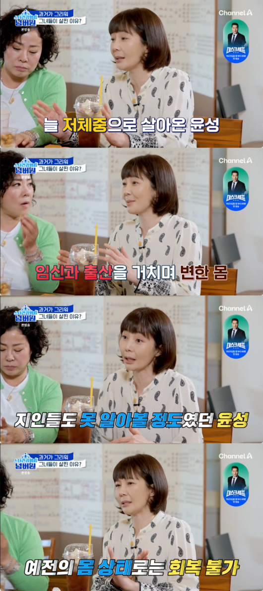 늘 마른 몸매를 유지했던 이윤성 역시 충격적인 과거를 고백했다. 그는 "2~30대 때 늘 말라있었고 저체중이었다"고 회상했다. 하지만 임신과 출산 후 상황은 180도 달라졌다. 이윤성은 임신하고 출산하는 과정에서 무려 37kg이 쪄 90kg까지 도달했다고 밝혀 모두를 놀라게 했다. 그는 "내 친한 지인들이 날 지나쳤다. 못 알아본다"며 급격한 외모 변화로 인해 겪었던 서러움을 털어놨다.