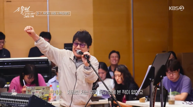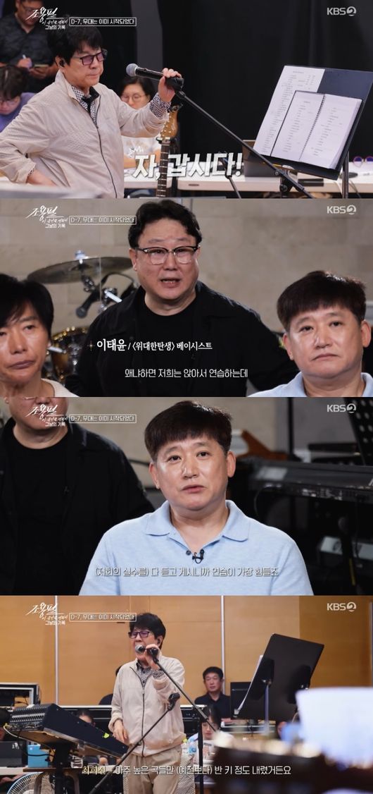 공연 7일 전, KBS 본관 연습실을 찾은 조용필은 공연 실시간 타임라인에 맞춰 실제 상황으로 연습하는 원칙이 있었다. 이에 대해 밴드 ‘위대한 탄생’ 베이시스트 이태윤은 “연습할 때 저는 긴장을 많이 한다. 왜냐하면 저희는 앉아서 연습하는데 형님은 항상 서 계신다. 연습을 실전처럼 하는 보컬리스트 지금껏 저는 우리 형님 외에는 본 적이 없다”라고 전했다.