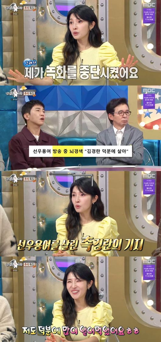 ‘라디오스타’ 김경란이 선우용여 뇌경색 감지 후 녹화를 중단한 일화를 전했다.